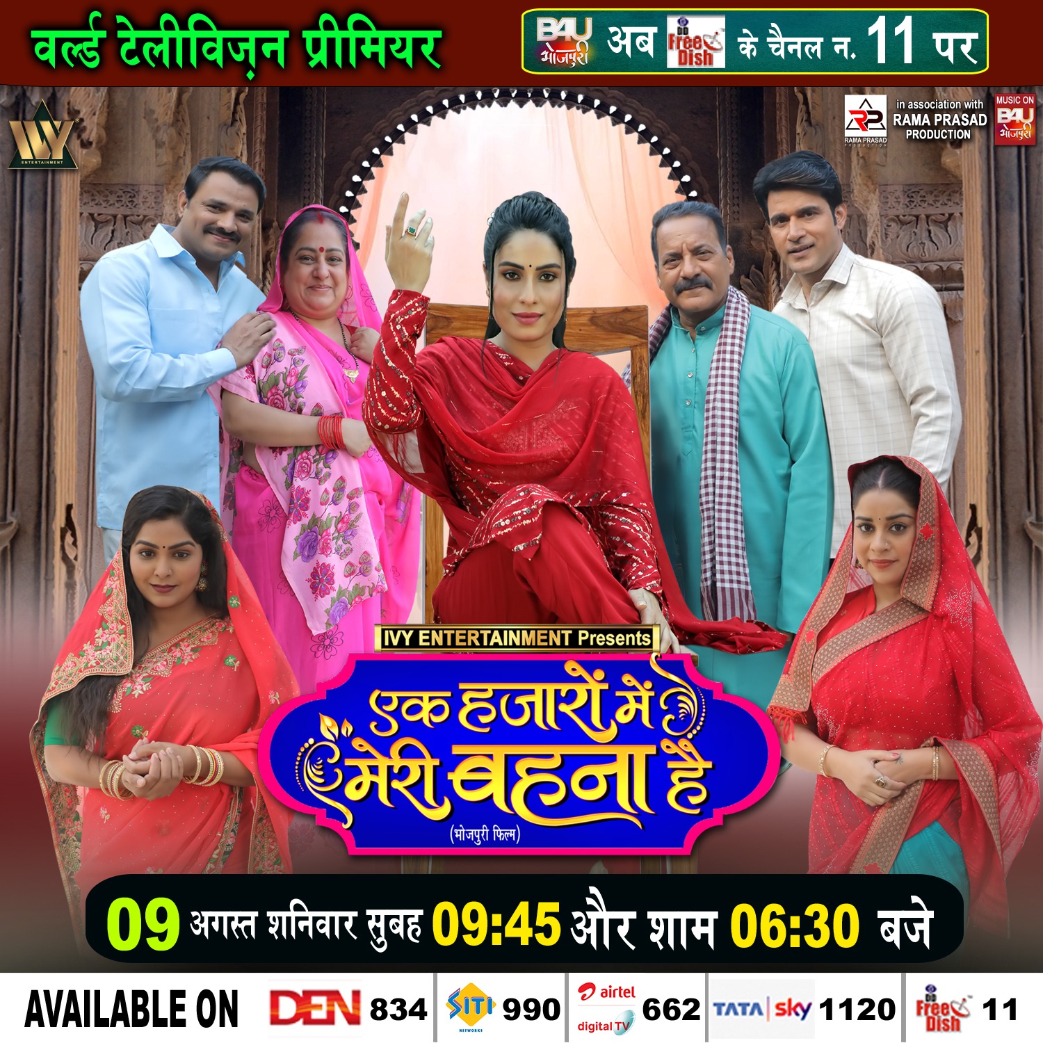 IVY एंटरटेनमेंट प्राइवेट लिमिटेड प्रस्तुत इन एसोसिएशन विथ रामा प्रसाद प्रोडक्शन कि भोजपुरी फ़िल्म एक हज़ारो मे मेरी बहना है रक्षाबंधन के शुभ अवसर पर रिलीज होगी ये जानकारी इस फ़िल्म के निर्देशक संजीव बोहरपी ने दी आपको बता दे कि इस फ़िल्म को बी फॉर यु के भोजपुरी चैनल पर 9 अगस्त सुबह 9:45 और री टेलीकास्ट शाम 6:30 बजे किया जायेगा
