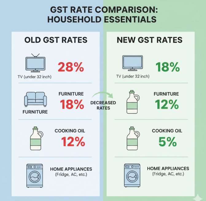 - फर्नीचर: 18% से घटकर 12% GST