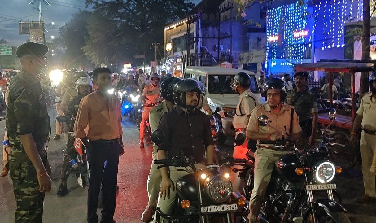 Dhanbad : दुर्गा पूजा को शांतिपूर्ण तरीके से संपन्न कराने एवं जिले की विधि व्यवस्था व अन्य तैयारियों को लेकर शनिवार की देर शाम उपायुक्त सह जिला दंडाधिकारी आदित्य रंजन तथा वरीय पुलिस अधीक्षक प्रभात कुमार ने बाइक से फ्लैग मार्च निकालकर जिले का भ्रमण कर विभिन्न पूजा पंडालों में व्यवस्था का जायजा लिया।