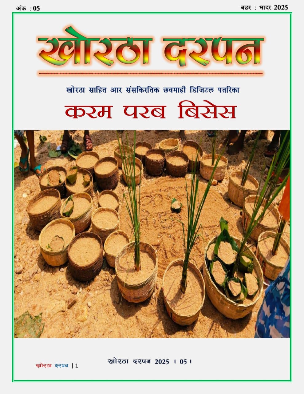 रामगढ़ : खोरठा दरपन के प्रधान कार्यालय लखी रानी निवास में करमा परब के अवसर पर डिजिटल पत्रिका खोरठा दरपन के पाँचवें अंक का लोकार्पण किया गया। जल, जंगल, जमीन एवं माय-माटी-मानुस को समर्पित यह पत्रिका खोरठा भाषा, साहित्य और संस्कृति की छमाही पत्रिका है। इसमें खोरठा स्मृति, संस्कृति, प्रकृति, पर्व-त्योहार से जुड़े आलेख, गीत, कविता, निबंध, कहानी, लेख, एकांकी आदि प्रकाशित होते हैं।