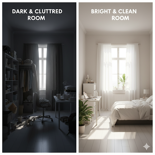 - तरीका: बेकार का सामान (Broken Items, Empty Bottles) फेंक दें। Windows खोलकर Fresh Air और Sunlight आने दें।