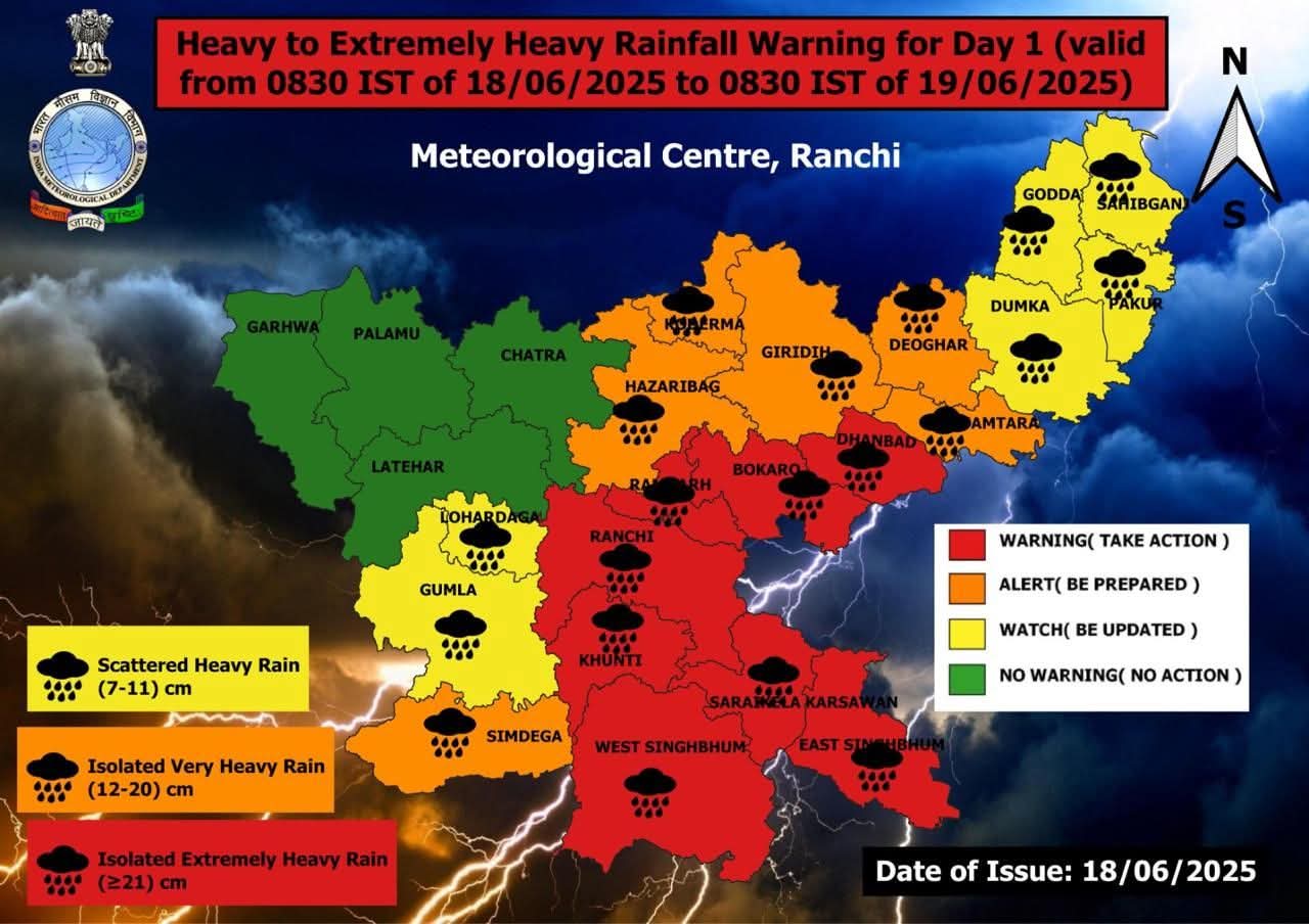 राँची : मौसम विभाग ने 18 व 19 जून के लिए रेड अलर्ट जारी किया है, जिसमें भारी बारिश, तेज हवाओं और संभावित आपदा की चेतावनी दी गई है। इस गंभीर स्थिति को देखते हुए जिला प्रशासन ने सभी संबंधित विभागों और नागरिकों को सतर्क रहने और आपातकालीन तैयारियों को सुनिश्चित करने का निर्देश दिया गया।