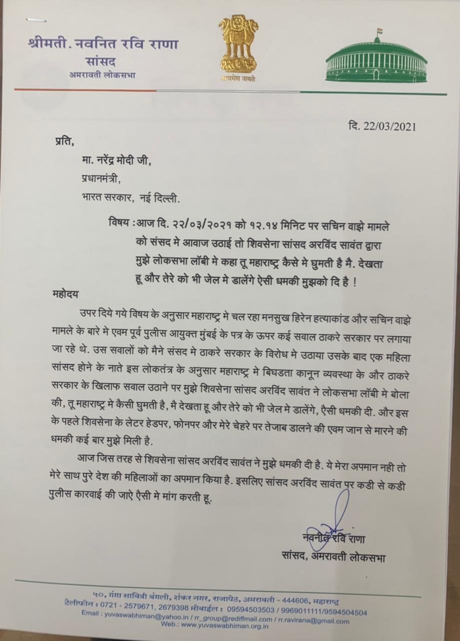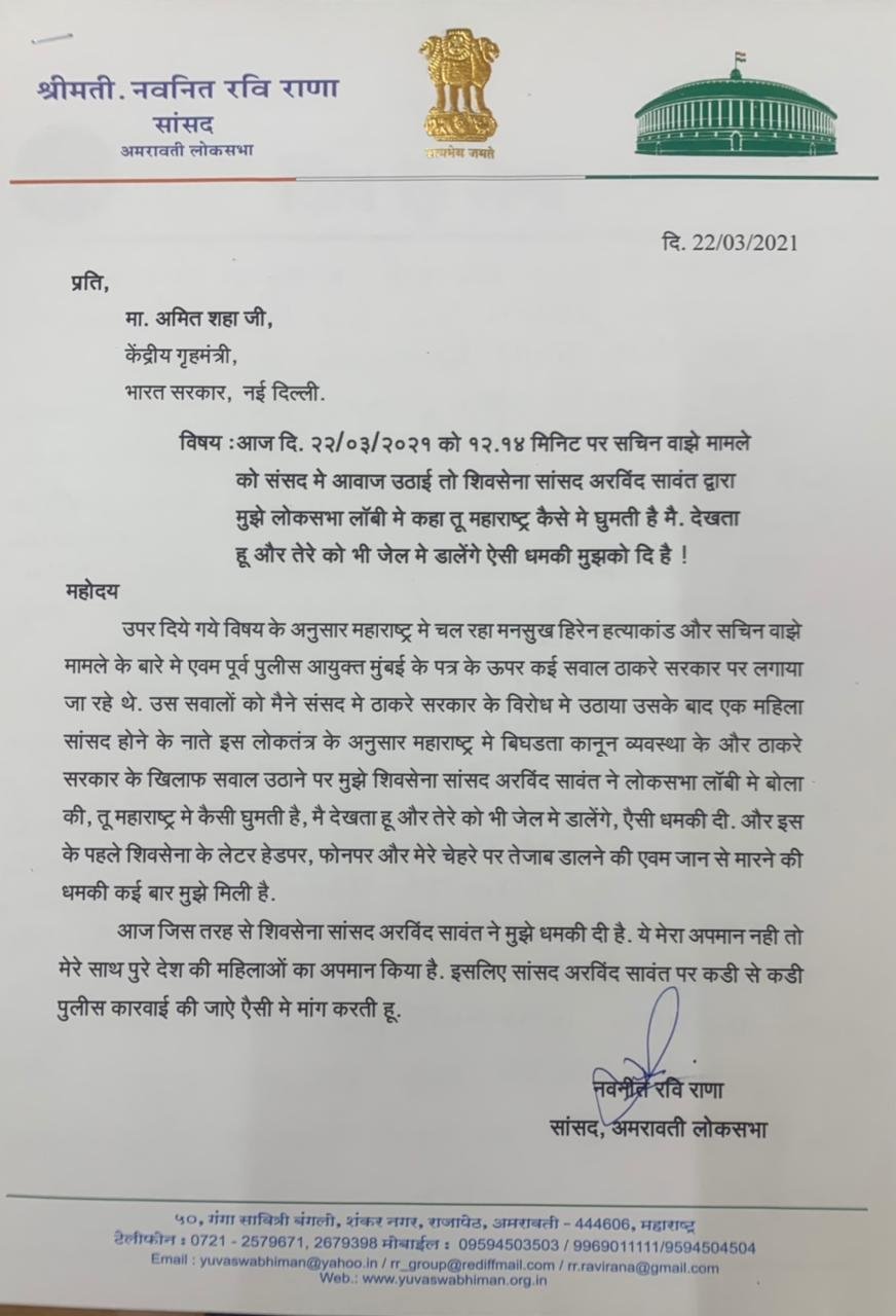 राणा ने लोकसभा स्पीकर ओम बिरला को लिखे अपने पत्र में आरोप लगाया कि सावंत ने उन्हें धमकी देते हुए कहा था कि ‘तू महाराष्ट्र में कैसे घूमती है मैं देखता हूं और तेरे को भी जेल में डालेंगे।’ उन्होंने कहा कि अरविंद सावंत ने उनके खिलाफ जिस तरह की भाषा का इस्तेमाल किया है वह उनका और पूरे देश की महिलाओं का अपमान है। वह उनके खिलाफ सख्त पुलिस कार्रवाई चाहती हैं।