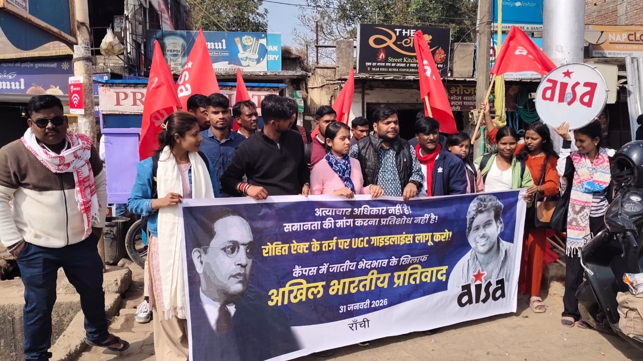 रांची । कैंपस में जातीय भेदभाव के खिलाफ कानून बनाने और रोहित एक्ट की तर्ज पर विश्वविद्यालय अनुदान आयोग (UGC) की गाइडलाइंस को सभी उच्च शिक्षण संस्थानों में लागू करने की मांग को लेकर ऑल इंडिया स्टूडेंट्स एसोसिएशन (आइसा) झारखंड ने शुक्रवार को रांची में विरोध प्रदर्शन किया। इस अवसर पर बिरसा मुंडा की प्रतिमा पर माल्यार्पण कर अखिल भारतीय प्रतिवाद आयोजित किया गया। प्रतिवाद में जेएनयू छात्र संघ के पूर्व अध्यक्ष कॉमरेड धनंजय शामिल हुए।