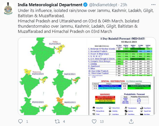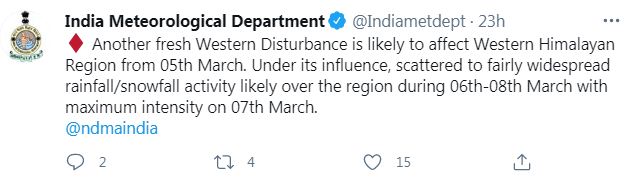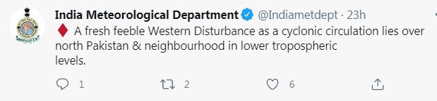 भारतीय मौसम विज्ञान विभाग ने अपने आधिकारिक ट्विटर हैंडल पर जानकारी दी है कि उत्तरी पाकिस्तान के ऊपर एक ताजा पश्चिमी विक्षोभ पैदा हुआ है। इसका असर भारत के कुछ हिस्सों पर देखने का मिलेगा।
